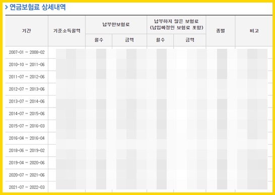 국민연금 납부액 조회를 로그인하게 되면 재무설계항목에서 가입내역 조회를 통해 총 납부내역을 확인할 수 있습니다. 지금까지 낸 금액과 총 개월 수 그리고 연금보험료에 대한 상세내역까지 1년 단위로 나오게 됩니다.